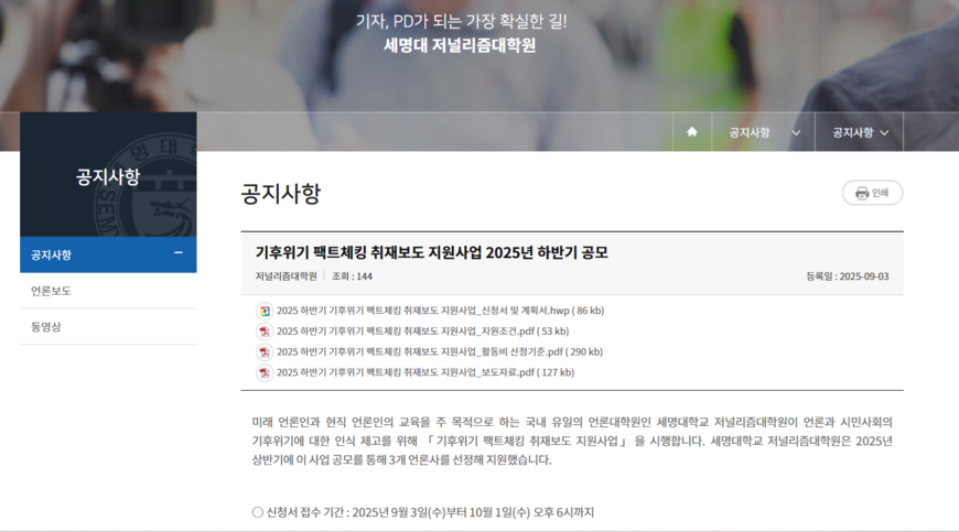 국내 언론 기후위기 관련 보도와 팩트체크의 양적·질적 성장에 기여한다는 취지를 지닌 세명대학교 저널리즘대학원의 ‘기후위기 팩트체킹 취재보도 지원 사업’이 2025년 하반기 공모를 진행한다.