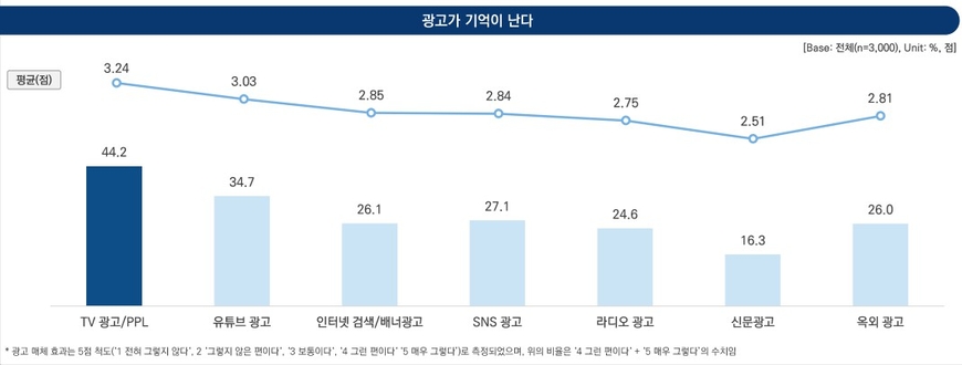 구체적으로 ‘광고가 기억에 난다’는 문항에선 44.2%의 응답을 얻어 유튜브 광고(34.7%), SNS 광고(27.1%), 인터넷 검색/배너광고(26.1%) 등에 상당 폭 앞섰고, ‘광고가 믿을 만하다’ 문항에서도 22.5%의 응답을 얻어 최고 수준을 기록했다.