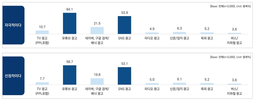 유튜브 광고의 경우 ‘광고 기억(34.7%)’, ‘구매 의향(36.4%)’, ‘검색 의향(40.0%)’ 등에선 모두 TV 광고에 이은 2위를 차지했지만, ‘자극성(64.1%)’, ‘선정성(58.7%)’, ‘가짜 뉴스(63.7%)’ 등 부정적 이미지에선 가장 높은 수치를 기록해 광고 효과는 크지만 신뢰성은 다소 낮은 매체임이 나타났다.