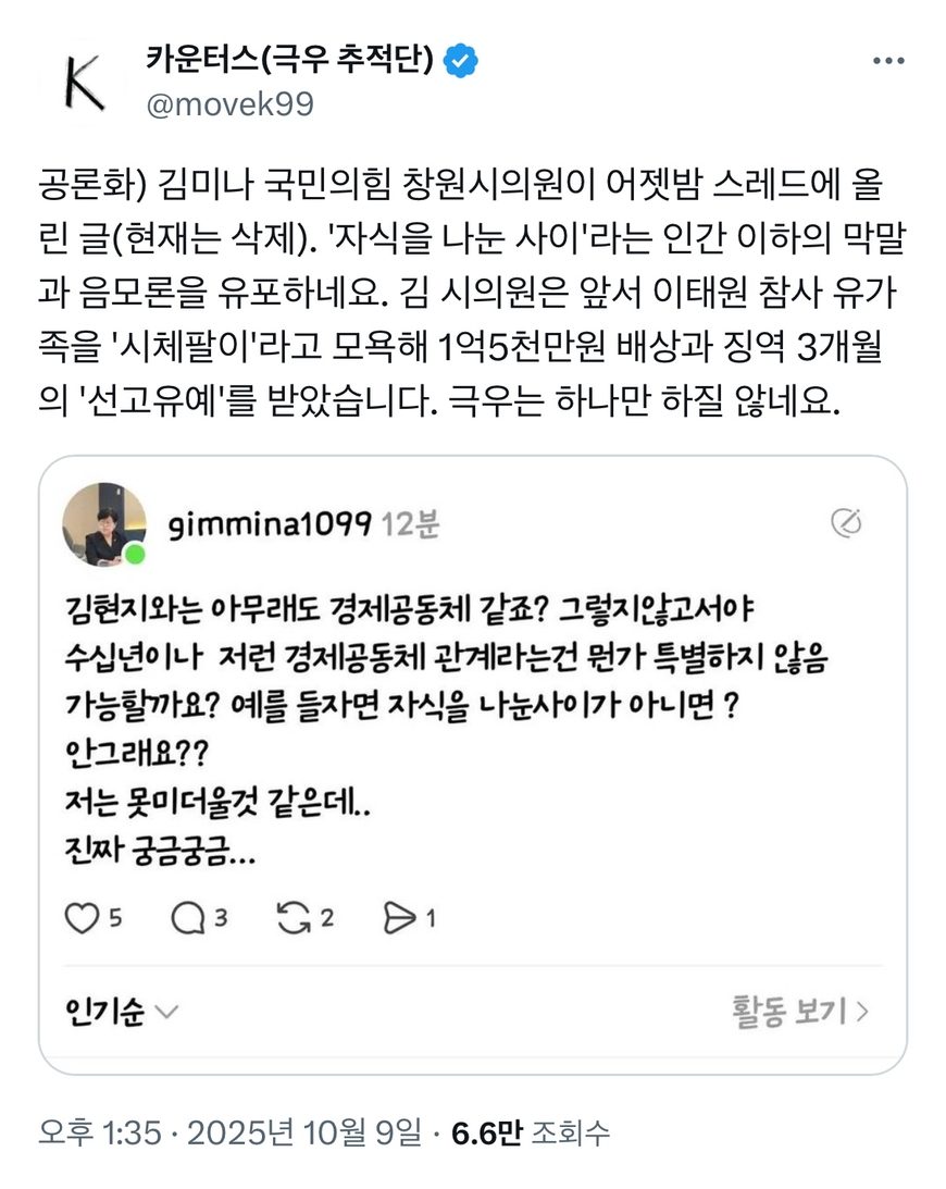 김미나 의원은 최근 대통령실과 관련한 막말 논란으로 10월21일 창원시의회 윤리특위에 회부됐다. 김 의원은 10월8일 자신의 SNS에 ‘김현지와는 아무래도 경제공동체 같죠? 그렇지 않고서야 수십 년이나 저런 경제공동체 관계라는 건 뭔가 특별하지 않으면 가능할까요? 예를 들자면 자식을 나눈 사이가 아니면?’이라는 글을 올렸다.