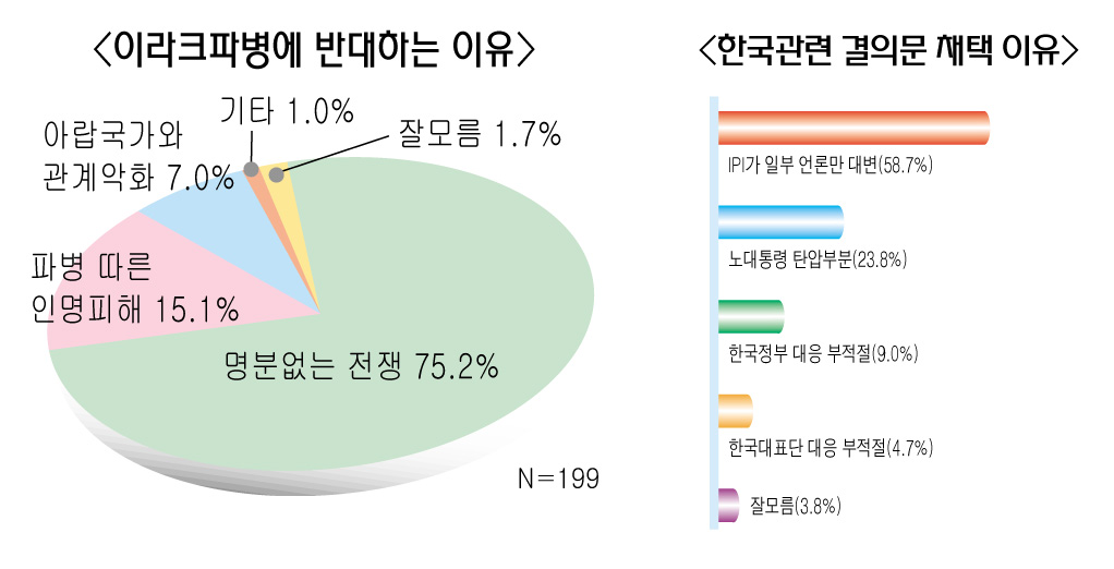 파병에 찬성한 기자들(N=75) 가운데 찬성이유를 묻는 질문에는 ‘경제적인 이득’(41.2%)을 가장 많이 꼽았다. 그 다음은 ‘미국과의 관계’(32.2%), ‘국제사회에서의 지위 상승’(22.8%) 순이었다. 반면 파병에 반대한 기자들(N=199)은 반대 이유로 ‘명분 없는 전쟁’(75.2%)을 가장 많이 꼽았으며, 그 다음은 ‘파병에 따른 인명 피해’(15.1%), ‘아랍국가와의 관계 악화’(7.0%) 순으로 나타났다.