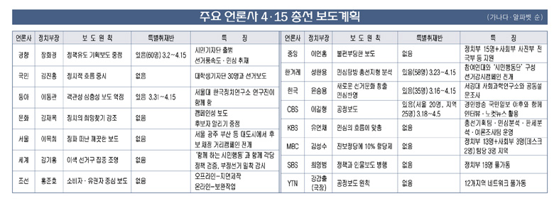 경향신문 국민일보 동아일보 한겨레 한국일보 등은 35~60명에 달하는 특별취재반을 가동하고 있다. 경향은 올해 처음으로 20명으로 구성된 ‘시민기자단’을 출범, 지역민심과 선거풍속도를 취재할 계획이다. 지난해 12월부터 총선보도를 준비한 동아는 서울대 한국정치연구소 45명의 교수진 및 연구팀, 각계 전문가 20명 등과 함께 심층적이고 객관적인 보도를 전개할 방침이다. 지면할애도 타사보다 많은 5~6개 면을 유지하면서 전체 지역구를 모두 다루기로 했다.