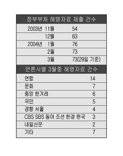 국정홍보처 자료에 따르면 지난해 11월 54건이던 기사 해명자료가 12월에는 63건으로 늘었다. 또 올 1월에는 76건, 2월 73건, 3월(29일 기준) 73건 등으로 나타나 지난해 보다 오히려 증가했다. 특징적인 것은 신문사와 통신사가 해명자료의 대부분을 차지했으며 방송사의 경우는 미미했다.