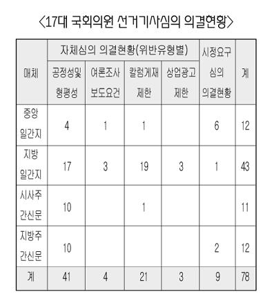 언론중재위 선거기사심의위는 선거 관련 기사가 게재되고 있는 정기간행물 495종의 공정성 여부 자체 심의를 통해 69건의 위반결정을 내렸다. 또 후보자의 시정요구 심의 9건을 처리하는 등 모두 78건에 대해 심의·의결했다.