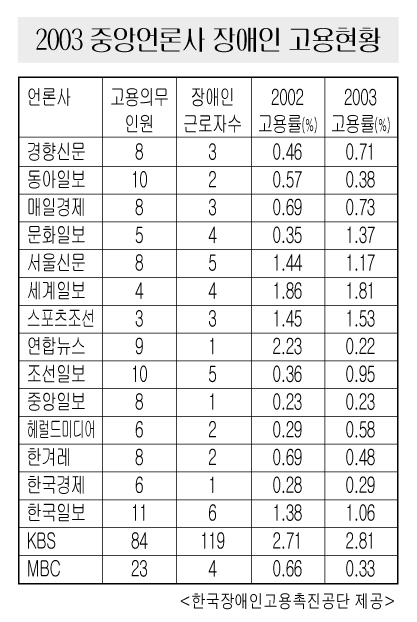 본보가 제24회 장애인의 날을 맞아 16개 중앙언론사의 2003년도 장애인 고용현황을 분석한 결과에 따르면 이들 언론사의 장애인 고용률 평균은 0.92%였다. 이는 일반 민간기업의 평균 고용률인 1.12%에도 크게 밑도는 수치다.