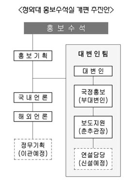 청와대는 우선 대변인팀 산하에 연설담당비서관실 신설을 추진하고 있는 것으로 알려졌다. 또한 정무수석실이 폐지될 경우 정무수석실에서 관장해 오던 일부 업무를 홍보수석실이 대신 맡게 되고, 홍보수석실도 ‘홍보기획수석실’로 명칭이 바뀌게 될 것으로 보인다.