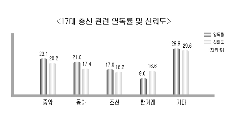 중앙일보가 17대 총선과 관련한 신문 열독률과 신뢰도 부분에서 모두 조선일보를 앞지른 것으로 나타났다. 특히 조선은 동아일보 보다도 뒤진 것으로 조사됐다.