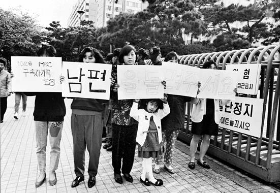 92년 10월 12일 MBC 본사 앞에서 구속된 노조원 가족들이 사장면담을 요구하고 있다. MBC노조는 9월 공정보도를 요구하며 임단협 협상을 요구했으나 사측의 불성실한 협상으로 파업을 결의했고 사측은 10월 2일 공권력을 투입, 노조원들을 강제 연행하는 등 파장이 확산됐다.