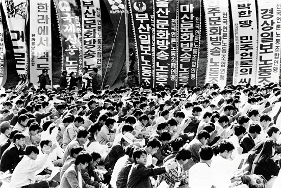 91년 10월 20일 성균관대학교에서 열린 민주언론대동제. 1천여명의 언론사 노조조합원과 가족들이 모여 민주언론수호를 다짐했다.