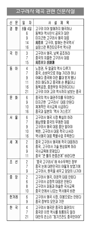 8월 1일부터 21일 현재까지 국민 경향 동아 문화 서울 세계 조선 중앙 한국 한겨레 등 국내 10개 중앙일간지에 나타난 ‘고구려사 왜곡’ 관련 사설은 모두 39건. 대부분의 신문들이 적게는 3건, 많게는 5건 가량 게재했다.