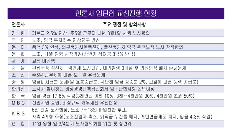 또한 KBS 서울신문 조선일보 등의 노사는 실무교섭을 꾸준히 벌이고 있으나 임단협 세부사항에 대한 입장차이로 팽팽히 맞서 있다.