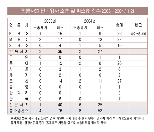 이같은 사실은 본보가 지난달 28일부터 2일까지 방송3사와 중앙 일간지 8개사를 상대로 2003~2004년(11월2일 현재까지)까지 ‘민·형사소송 및 피소송 건수 및 유형분석’ 조사 결과 밝혀졌다.