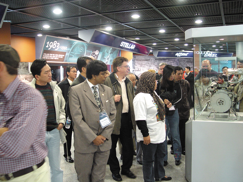 동아시아기자포럼에 참석한 언론인들이 19일 울산 현대자동차 전시장을 찾아 한국 자동차산업 현황을 직접 둘러보고 있다.