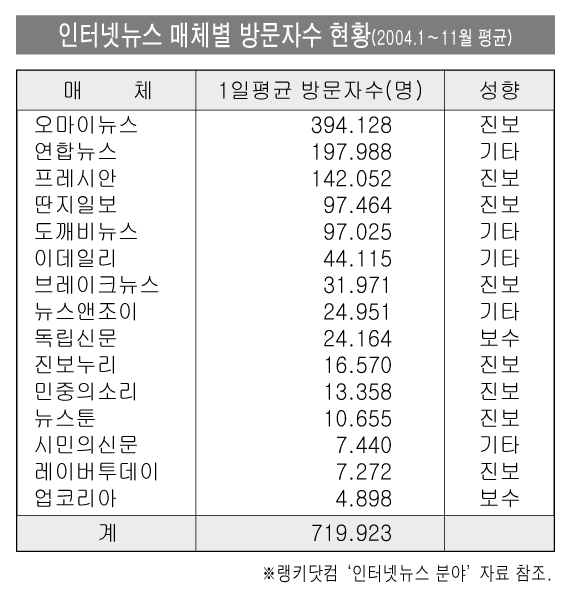 2004년 1월부터 11월까지 랭키닷컴 ‘인터넷뉴스 분야’의 하루평균 방문자수 상위 15개 사이트 가운데 진보 성향을 지닌 사이트는 오마이뉴스, 프레시안, 딴지일보, 브레이크뉴스, 진보누리, 민중의 소리, 뉴스툰, 레이버투데이 등 8개. 보수 성향을 지닌 사이트는 독립신문, 업코리아 등 2개 매체다. 그러나 연합뉴스, 도깨비뉴스, 이데일리, 뉴스앤조이 등과 오프라인 종속형인 ‘시민의 신문’ 등은 타 매체와 비교기준이 다르거나 이데올로기적 성향을 나눌수 없어 ‘기타’로 구분했다.