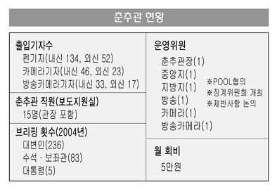 실제로 출입기자수가 참여정부전에는 90명에 불과했지만 11일 현재 3백5명(내신 1백34명, 외신 82명)에 달한다. 무려 3배 가까이 늘었다. 회원사도 50개사에서 1백77개사로 1백27개사가 증가했다.