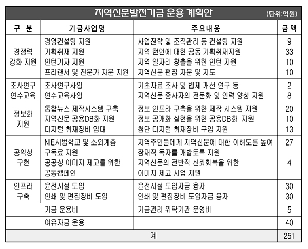 문화관광부가 18일 밝힌 ‘지역신문발전기금 운용계획(안)’에 따르면 올해 집행될 2백51억원의 국고 출연 기금은 △경쟁력 강화지원 사업 62억원 △조사연구 연수교육 10억원 △정보화 지원 43억원 △공익성 구현 31억원 등으로 계획돼 있다.