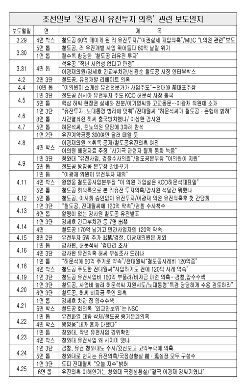 조선은 지난달 29일 MBC에서 철도공사 유전투자 의혹이 처음으로 다뤄진 이후 25일 현재까지 무려 24일 연속으로 이 문제를 집중적으로 제기했다.