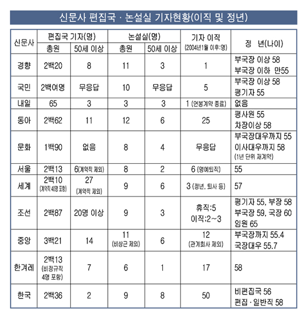 한국일보의 경우 편집국기자 2백36명 가운데 50세 이상은 단 2명뿐이었다. 서울신문은 2백13명중 6명, 한겨레는 2백13명중 7명으로 밝혀졌다. 반면 세계일보는 2백10명중 27명, 조선일보는 2백87명 가운데 20명이상으로 각각 조사됐다.