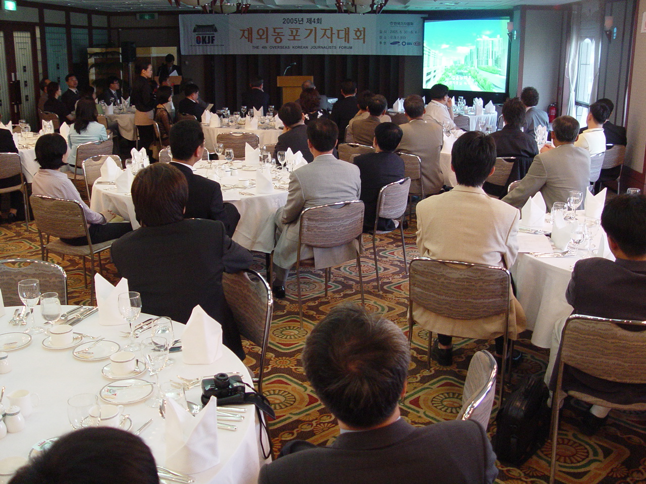 제4회 재외동포기자대회에 참석한 70여명의 재외동포 기자들이 이명박 서울특별시장이 주최한 만찬장에서 서울시 홍보 비디오를 시청하고 있다.