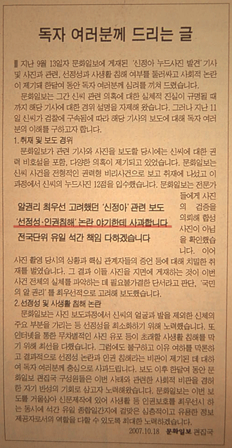 문화일보가 18일 신정아씨 누드사진 게재에 대해 사과했다. 지난달 13일 신씨의 누드사진을 실어 사회적 파문을 일으킨 지 35일만이다.