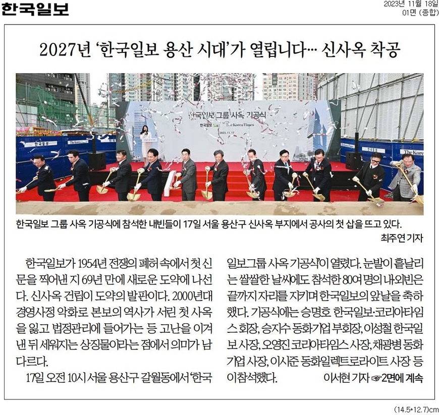 2023년 11월17일 서울 용산구 갈월동 사옥 예정지에서 열린 '한국일보그룹 사옥 기공식'을 전한 당시 기사.