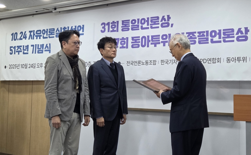 이날 기념식이 끝난 후엔 제31회 통일언론상 시상식, 제37회 동아투위 안종필언론상 시상식이 진행됐다. 한국기자협회 등 언론 3단체가 평화통일과 남북화해·협력에 기여한 보도물에 시상하는 통일언론상은 올해 대상 없이 특별상 수상작으로 경남도민일보의 <광복 80주년 다시 평화>, 뉴스1의 <155마일>, G1의 <경계탐구 파노라마-세계의 벽>, KBS의 <다큐 인사이트-두고 온 아이들> 등 네 편을 선정했다.