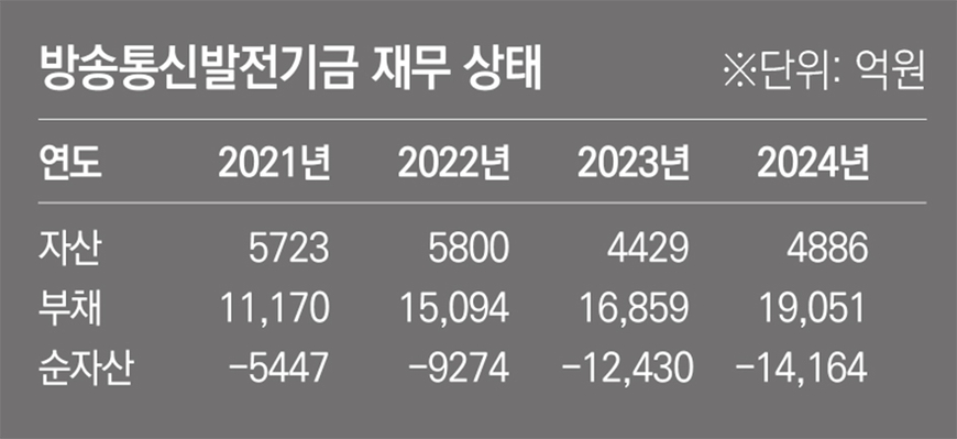 수입 감소, 부채 증가 등 방발기금 재정이 악화되는 상황에서 기금 취지와 무관한 사업 지원이라는 지적도 있었다. 기획재정부의 기금별 재무제표를 보면 방발기금의 순자산은 2019년 763억원에서 2024년 -1조4165억원으로 크게 악화됐다. 부채 규모도 2021년 이후 크게 늘어나 2024년 1조9051억원에 달했다.