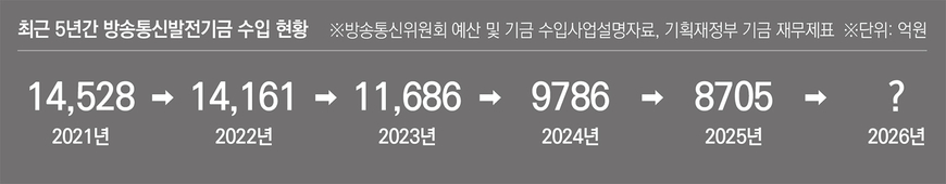 방발기금 수입은 매년 줄어들고 있다. 2021~2022년 1조4000억원대였던 전체 수입이 2023년엔 1조1000억원대로 급격히 감소했고, 2024년엔 9786억원, 지난해엔 8705억원으로 줄었다. 방발기금 수입 재원 중 가장 큰 비율을 차지하는 방송사와 통신사업자가 내는 분담금인 ‘법정부담금’이 감소하고 있는 탓인데, 2021년 9986억원이었던 법정부담금 수납액은 매년 줄어 2025년 5633억원까지 떨어졌다.
