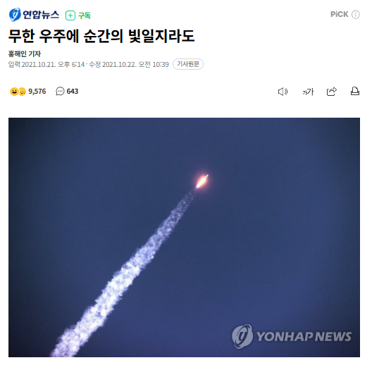 이처럼 기자들이 포착하려 했던 ‘순간의 빛’이 독자에게는 또 다른 의미로 다가서기도 한다. 2021년 10월21일, 1차 시험발사가 이뤄진 누리호의 모습을 담은 홍해인 연합뉴스 기자의 사진 기사가 그 예다. 보도된 지 4년이 넘었음에도, 이 기사가 주목받는 건 다름 아닌 기사의 제목 때문이다.