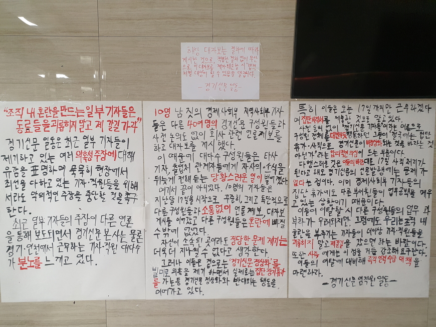 경기신문에 남아있는 기자들은 7일 사내에 대자보를 붙이고 사직서를 낸 기자들을 정면 비판했다.