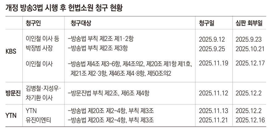 방송3법에 헌법소원을 청구한 대부분은 야권 인사로 분류되며 지난 정부 시절 임명된 공영방송 이사와 사장을 비롯해 개정 방송법의 적용을 받는 방송 사업자 등이다. KBS와 MBC 대주주인 방문진 일부 이사들은 각 이사회를 법 시행 후 3개월 내 새로 구성토록 하고 현 이사들은 후임자가 선임될 때까지 그 직무를 수행한다는 내용의 부칙을 문제 삼았다. 개정 방송3법은 각 공영방송 이사 수를 확대하고, 추천 주체를 다양화하도록 규정했다. 해당 방송법과 방문진법은 각각 지난해 8월26일, 9월9일 공포·시행됐다.
