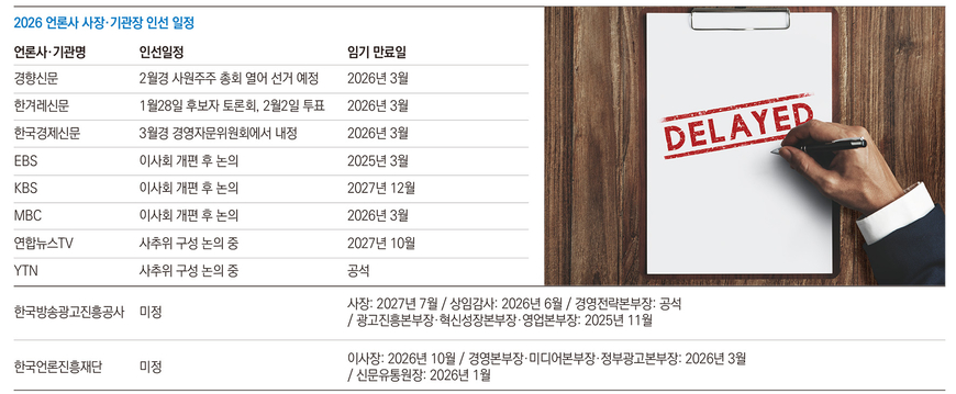 경향신문, 한겨레신문 등 일부 언론사가 3월 안에 새 대표이사를 선임한다. 미디어 산업 전반의 위기가 심화하는 가운데 이를 해결할 적임자가 누구인지 관심이 쏠린다. 반면 주요 방송사와 언론 유관기관의 사장·이사장·이사 선임은 제도적 공백과 정치 일정 지연으로 표류하고 있다. 이미 임기가 만료됐거나 공석인 곳들도 수개월에서 1년이 넘도록 후임 인선 절차를 시작하지 못하며 선임 일정이 총체적으로 지연되는 상황이다.