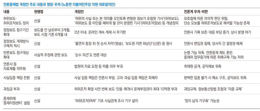이 같은 현실에서 ‘허위조작정보 근절법’ 2탄 격으로 추진되는 언론중재법 개정안 역시 언론계 우려가 나올 수밖에 없는 다수 조항을 포함한 상태다. 노종면 더불어민주당 의원이 지난해 11월 대표 발의한 언론중재법을 보면 일례로 반론보도 청구요건을 “언론보도 등은 사실관계에 관한 내용에 한정하지 아니한다”며 ‘순수의견’도 반론 대상으로 명시했다. 사설·칼럼에 담긴 의견이라도 근거가 된 사실관계(혼합의견)는 다툴 수 있지만 의견 자체에 대해선 정정·반론을 허용하지 않았던, 법 근간을 바꾸는 변화다.