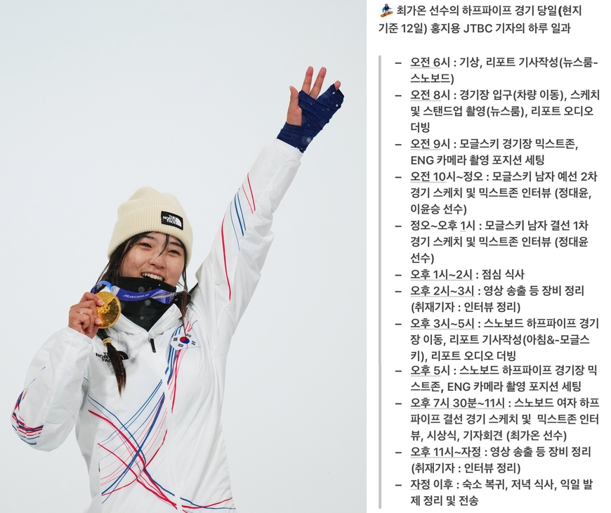 최가온 선수가 금메달을 획득했던 스노보드 하프파이프 경기를 취재하는 동안에도 기자들은 한 마음으로 최 선수를 응원했다. 최 선수가 기술을 시도하다 넘어진 1차 시기, 믹스트존 취재진의 눈에는 머리와 무릎이 동시에 바닥에 떨어지는 위험한 장면이 포착됐다. 10분 이상 경기가 중단되고 전광판에 ‘DNS(출전 안 함)’ 표식이 뜨자 현장 분위기는 얼어붙었다. 김수근 MBC 기자는 “현장에 있던 모두가 큰 부상으로 이어지지 않기를 바랐다”고 당시 상황을 전했다.