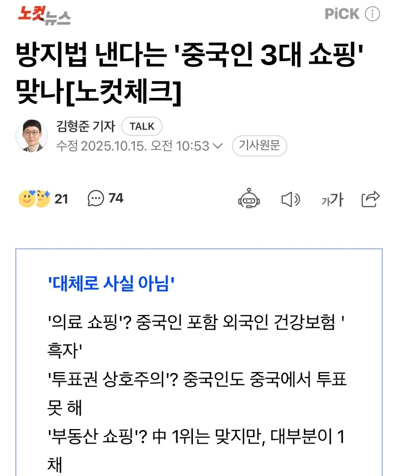 실제 언론의 팩트체크 기사(<방지법 낸다는 ‘중국인 3대 쇼핑’ 맞나>, 노컷뉴스 10월15일)에선 같은 내용이 반복 확인된다. 중국인 대상 건보료 적자 규모는 2023년까진 적자였지만 2024년 55억원 흑자로 돌아섰다. 전체 외국인 재정수지도 2016년 이후 계속 흑자를 기록하는 상태(2024년 기준 순이익 9439억원)다. ‘부동산 쇼핑’ 주장 역시 반만 맞는 말이다. 외국인 주택보유 1위는 중국인이지만 면적 기준 토지보유 1위는 미국(52.5%)이고, 중국은 전체 7.9%에 불과하며, 외국인 90% 이상은 부동산을 1채만 소유하고 있다는 국토교통부 통계로 반박된다. 대출과 관련해서도 중국인은 내국인처럼 금융규제 적용을 똑같이 받는다.