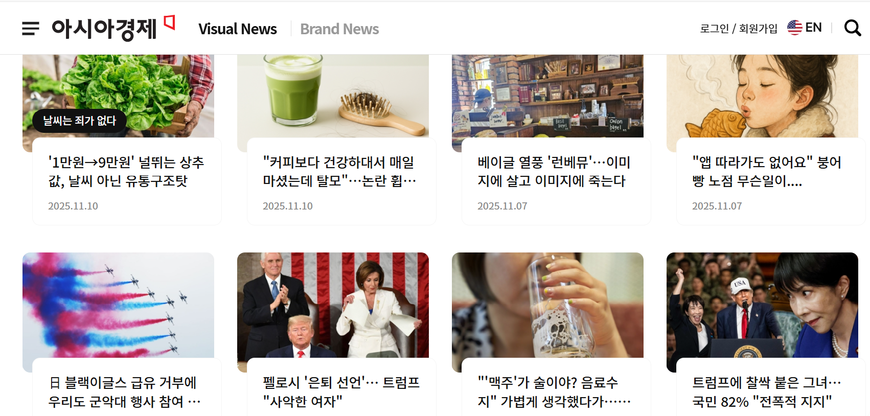 아시아경제 편집기자들이 신문 편집을 하면서 ‘비주얼 뉴스’라는 온라인 콘텐츠를 만들고 있다. 기존 기사에 제목과 레이아웃을 달리해 편집하거나 기사 내용을 재구성해 제작한 온라인 콘텐츠다. 큼지막한 이미지 여러 장에 온라인에 어울리는 제목을 달아 디지털에 최적화한 게 특징이다. 편집부는 전산팀과 협의해 아시아경제 홈페이지에 ‘비주얼 뉴스(Visual News)’라는 섹션을 만들고, 가독성을 높이기 위해 스크롤을 내리면 이미지에 텍스트가 따라오거나 사진을 가로로 여러 장 배열할 수 있는 기능도 추가했다.