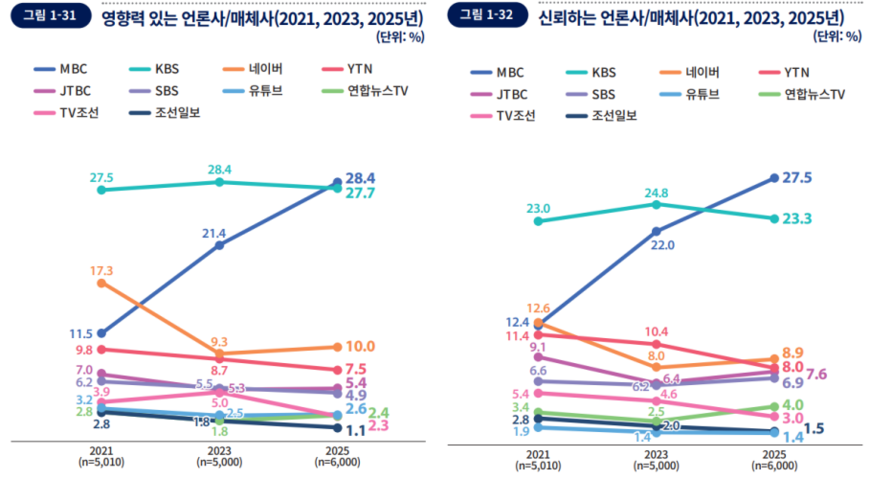 매체 영향력·신뢰도 조사에서도 종이신문은 열세를 보였다. 이용자들이 영향력 있다고 생각하는 언론·매체 상위 10개사 중 종이신문은 조선일보가 유일했다. 1위 MBC, 2위 KBS를 비롯해 7개사가 방송사였고, 네이버(3위)와 유튜브(7위)도 포함됐다. 신뢰도 역시 비슷한 경향을 보였다. 다만 유튜브가 영향력보다는 순위가 하락해 10위를 나타냈다.