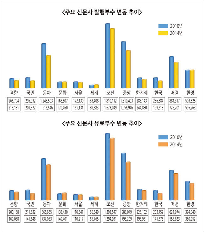 실제로 동아일보(4.2%), 서울신문(2.1%), 한국경제(3.1%), 문화일보(1.7%), 국민일보(1.1%), 조선일보(0.1%), 매일경제(0.1%) 등은 전년보다 유가부수가 늘어난 반면 한국일보(-11%), 중앙일보(-2%), 한겨레(-0.9%), 경향(-0.06%) 등은 감소했다.