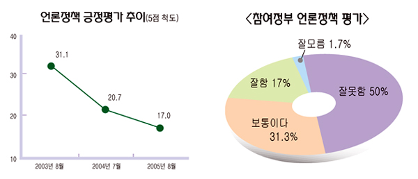특히 노무현 정부의 언론정책에 대한 평가는 3년째 하락세를 보였다. 실제로 2003년 8월 조사(기자협회 창립 39주년)에서는 잘하고 있다가 31.1%(잘못함 33.2%)였지만, 지난해 7월 조사결과(〃 창립 40주년)는 잘하고 있다가 20.7%(잘못함 45.4%), 올해에는 17%로 갈수록 낮아졌다.