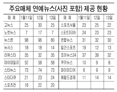 ‘뉴스엔’의 경우 11일-98건, 12일-96건, 13일-80건 등을 생산했으며 다음으로 ‘스타뉴스’가 11일-73건, 12일-74건, 13일-73건, ‘마이데일리’가 11일-52건, 12일-58건, 13일-58건 등으로 나타났다.