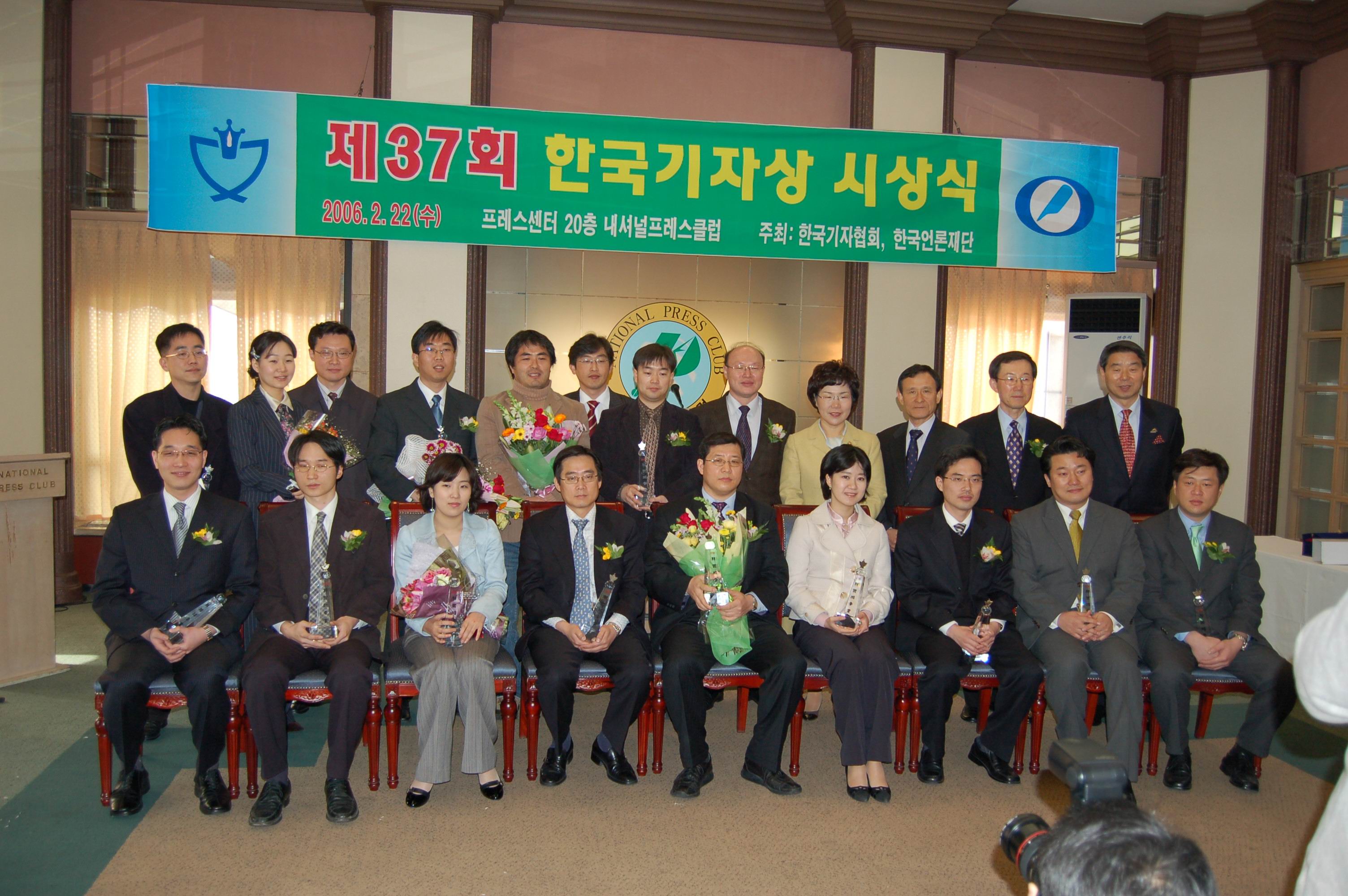 22일 낮12시 프레스센터 20층에서 열린 제37회 한국기자상 시상식에서 수상자들과 참석 내외빈이 함께 기념촬영을 하고 있다.
