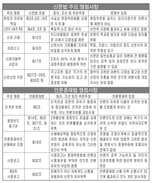 이밖에 신문산업 지원과 자료신고 등의 조항도 양측 입장이 팽팽한 상태이다.