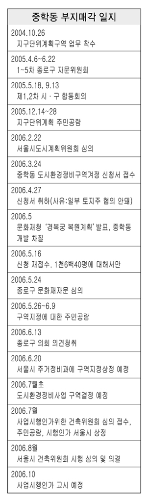 사업을 다시 추진할 즈음 또 하나의 악재가 터져 나왔다. 지난달 초 문화재청이 ‘경복궁 복원계획’을 내세워 경복궁 담장 선까지를 국가지정문화재로 지정하겠다고 발표한 것. 경복궁 1백 미터 이내의 건축물들이 문화재보호법 상의 규제대상에 포함돼 건축 자체가 불가능하게 되는 등 중학동 사옥 부지 일대의 재개발이 불가능하게 되는 조치다.