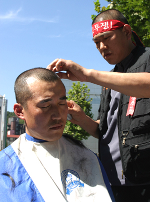 | ▲ EBS 추덕담 노조위원장이 7일 오후 사옥 앞에서 삭발식을 갖고 구관서 사장의 출근저지 투쟁의지를 보였다.(사진=EBS노조) | ||