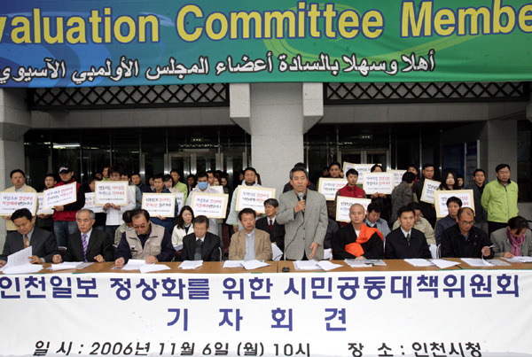 시민공대위(공동집행위원장 구교정 인천언론연대 사무처장·김송원 인천경실련 사무처장)는 6일 인천시청에서 열린 기자회견에서 “인천일보는 18년 전 민주화의 열망 속에 인천 최초의 지역 일간신문사로 탄생됐고 지난 몇 년간 여러 어려움 속에서도 언론개혁을 위해 노력해 왔다”며 “최근 인천일보 사태를 자본의 언론 자유화 음모와 개혁언론을 지지하는 시민사회 의지에 대한 정면승부로 규정했다”고 밝혔다.