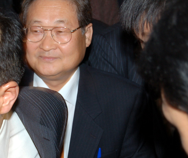 9일 오후 4시5분경 사장후보자 면접을 마친 정연주 전 KBS 사장이 경호원들에 둘러싸여 면접장인 롯데호텔 연회장 칼론룸을 나오고 있다. |