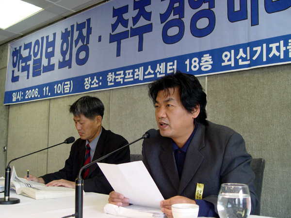 이날 기자회견에서 신학림 위원장은 “우리는 한국일보 사옥을 매입하기로 한 한일건설의 대주주로 있는 한일시멘트가 2004년 10월8일 서울경제신문의 유상증자에 참여해 지분 7.7%를 획득한 점에 주목한다”며 한일건설과 한국일보 사옥 개발 사이에서 증자 대금이 나오는 것일지도 모른다는 의혹을 제기했다.