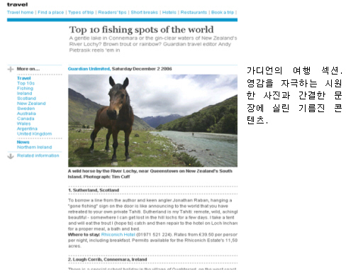 작품과 같은 사진, TV를 보는 듯한 영상, 화려한 디자인이 어우러진 영국 가디언지의 '여행' 섹션-웹 사이트는 론니 플래닛 같은 세계적 여행 전문지 수준의 콘텐츠를 보여준다. 이것은 열광적인 독자들의 호응으로 뒷받침되면서 '가디언'의 브랜드를 안팎으로 각인시킨다.