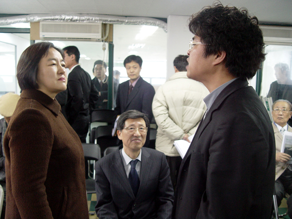 ▲ 14일 남영진 전 한국방송공사 감사를 대표이사로 선임하는 안건으로 열린 ‘시민의신문’ 임시주주총회에서 이형모 전 대표의 부인 노현숙 주주(왼쪽)와 노조위원장이자 사원주주인 이준희 취재팀장(오른쪽)이 설전을 벌이고 있다. 이형모 전 대표(가운데)가 앉아서 이들의 싸움을 지켜보고 있다. |