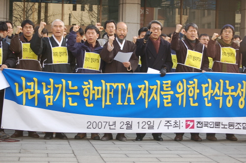 전국언론노동조합(위원장 신학림)은 12일 서울 프레스센터 앞에서 기자회견을 열고 한미FTA 7차 협상이 시작된 이날부터 15일까지 소속 조합원 80여명이 한미FTA 저지를 위한 단식농성에 들어간다고 밝혔다.
